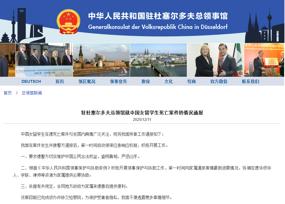 香港中通社12月11日電 中國駐杜塞爾多夫總領館12月11日就中國女留學生死亡案件發布情況通報,中國女留學生在德死亡案件引發國內輿情廣泛關注,領館在案件發生並接警方通報後,第一時間啟動領保應急響應機制,積極開展工作。