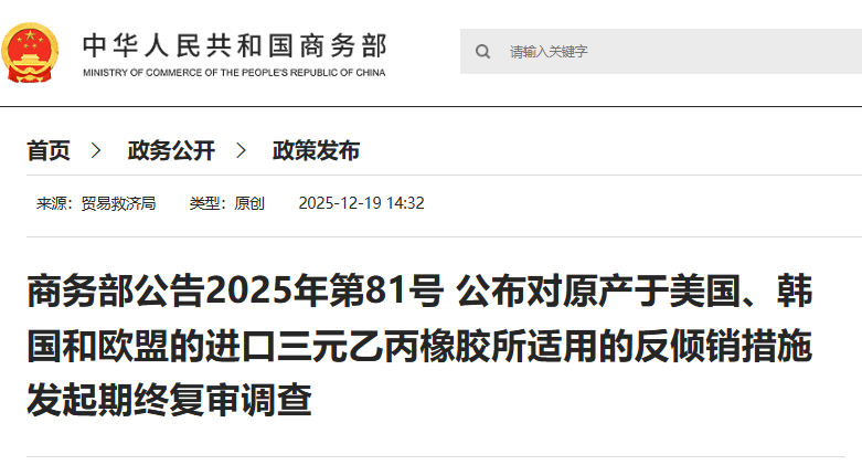 圖片來源:中國商務部網站截圖 據介紹,2020年12月,中國商務部公告,決定自當月20日起,對原產於美國、韓國和歐盟的進口三元乙丙橡膠徵收反傾銷稅,實施期限為5年。又據中國商務部2021年公告,2020年12月31日英國脫歐過渡期結束後,之前已對歐盟實施的貿易救濟措施繼續適用於歐盟和英國,實施期限不變;該日期後對歐盟新發起的貿易救濟調查及複審案件,不再將英國作為歐盟成員國處理。 2025年10月17日,中國商務部收到國內三元乙丙橡膠產業提交的反傾銷措施期終複審申請書。申請人主張,如果終止反傾銷措施,原產於美國、韓國和歐盟的進口三元乙丙橡膠對中國的傾銷可能繼續或再度發生,對中國產業造成的損害可能繼續或再度發生。申請人未對原產於英國的進口三元乙丙橡膠所適用的反傾銷措施提出期終複審申請。 經調查,中國商務部決定自2025年12月20日起,對原產於美國、韓國和歐盟的進口三元乙丙橡膠所適用的反傾銷措施進行期終複審調查,調查應於2026年12月20日前(不含本日)結束。其間,中國對原產於美國、韓國和歐盟的進口三元乙丙橡膠繼續按照商務部2020年公告公布的徵稅產品範圍和稅率徵收反傾銷稅。自2025年12月20日起,對原產於英國的進口三元乙丙橡膠所適用的反傾銷措施到期終止。(完) 【編輯:林曉惠】