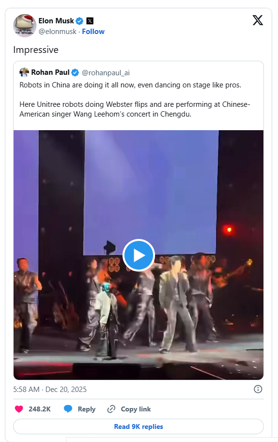 香港新聞網12月22日電(編輯 丘志彬)近日,美國企業家、特斯拉與太空探索技術公司(SpaceX)創辦人馬斯克在社交平台上,轉發了一段機器人在演唱會舞台上表演的視頻,再次掀起國際輿論對中國人形機器人的討論熱度。 有媒體不僅被中國人形機器人的表現所驚艶,形容其“在舞台大放異彩”,更驚訝於中國人形機器人技術升級的速度。 (來源:通視) 12月18日,6台來自中國宇樹科技的G1人形機器人,身著銀色亮片服裝,登台美國華裔男歌手王力宏在中國成都的演唱會舞台。它們在伴舞時,精準卡點音樂節奏,機械臂與人類舞步高度同步,舞台現場科技與藝術交融,未來感拉滿,贏得了觀眾的陣陣歡呼。 王力宏工作室發文認證“全球首個演唱會機器人舞台來襲”。 相關視頻隨即在網絡爆火,引發廣泛的關注。 當地時間19日,馬斯克在社交平台X也轉發了相關視頻,并評價稱“令人印象深刻(impressive)”。這則簡短評價,讓視頻更迅速地傳播。