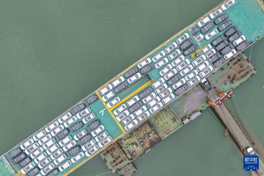 12月5日,在重慶果園港滾裝碼頭,“重慶造”新能源汽車在裝船,之後將通過“江海聯運”的方式出海。(圖源:新華社)