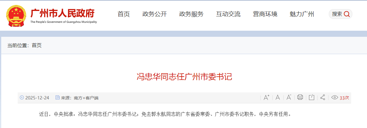 香港中通社12月24日電 近日,中共中央批准:馮忠華任廣州市委書記;免去郭永航的廣東省委常委、廣州市委書記職務,中央另有任用。