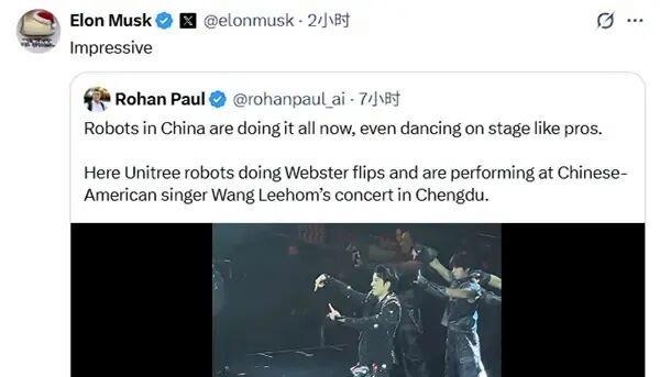近日,王力宏成都演唱會首次引入G1人形機器人伴舞。特斯拉CEO馬斯克轉發機器人在舞台上做韋伯斯特空翻的相關視頻,并配文“令人印象深刻”。