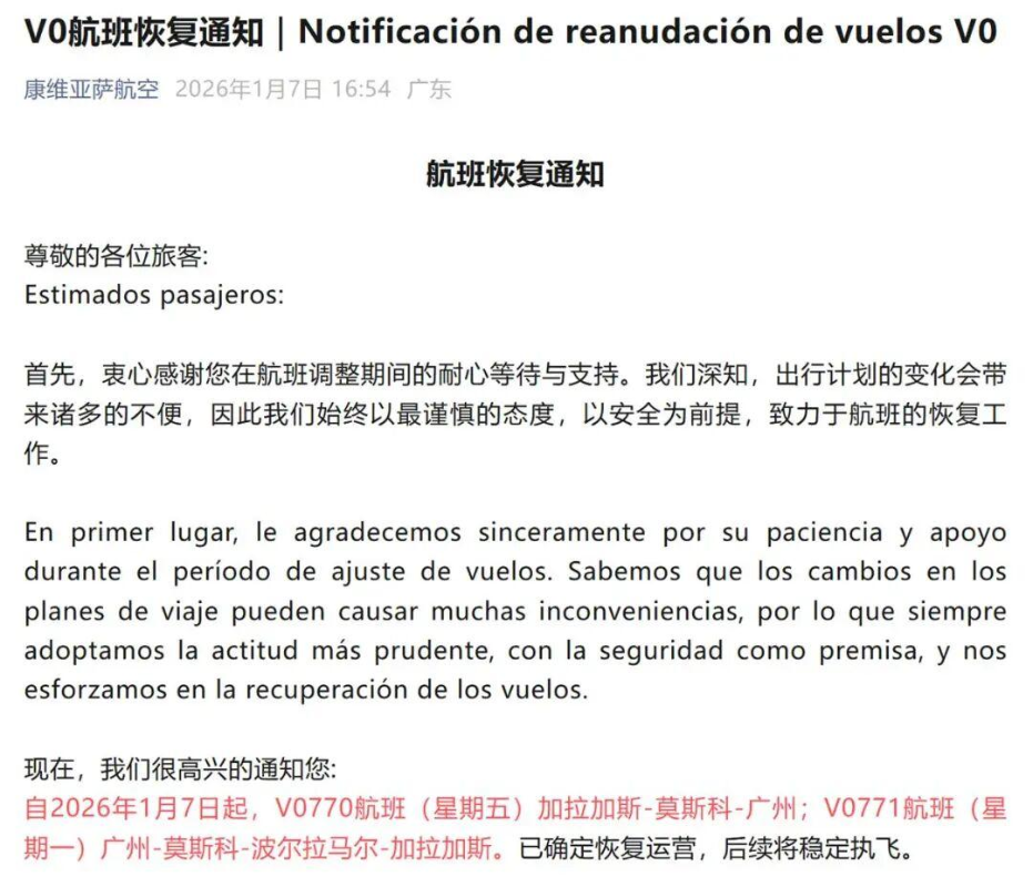 極目新聞報道,康維亞薩航空公司中國區客服工作人員確認該消息的真實性,并表示:“目前往返的航班都是正常的,每兩周一趟,後續如有變化會第一時間發佈公告的。” 康維亞薩航空發佈的通知寫道:“我們深知,出行計劃的變化會帶來諸多的不便,因此我們始終以最謹慎的態度,以安全為前提,致力於航班的恢復工作。航空公司載客載貨,雙軌并行。我們為每一位旅客提供優質服務的同時也利用寬體機的腹艙空間,提供高頻、穩定的貨運空間。” 此外,該航司還發佈了該航班的冬季時刻表。 據報道,“加拉加斯-莫斯科-廣州”系中國唯一直飛委內瑞拉的航線。1月3日,康維亞薩航空公司發佈航班取消通知稱,由於不可抗力因素,原計劃於2026年1月5日3時起飛的V0771航班由廣州飛往加拉加斯已被取消。 從航司處了解到,該客機後續將以空機不載客的形式返回委內瑞拉,具體通知已告知機場櫃檯,并在公眾號發佈。 航班管家APP顯示,廣州往返加拉加斯的航線需經停莫斯科,全程約30個小時。1月16日從加拉加斯到廣州的航班已顯示正常,1月19日從廣州到加拉加斯的航班也已正常。 (完) 【編輯:紀東】