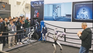 1月7日,一名男子在2026年美國拉斯維加斯消費電子展上走過印有“物理AI”字樣的展台。圖片來源:新華社 CES是全球消費技術產業頂級盛會之一,也是全球科技界“風向標”式的重量級展會。2026年CES於當地時間6日至9日舉行,吸引來自150多個國家和地區的逾4100家參展商,其中包括上千家中國企業。今年中企的參展規模較大,如海信、TCL等老字號佔據了主會場中心位置展台,觀眾絡繹不絕。與此同時,今年格外“吸睛”的是來自中企的創新科技成果,一些近年創立的科技企業也獨領風騷。 中國杭州“六小龍”之一、民營機器人企業宇樹科技這次帶來人形機器人H2、R1、G1及四足機器人A2、Go2等全系列機器人產品。當地時間6日,CES開幕僅十幾分鐘,宇樹科技展台便以一場“機器人格鬥賽”先聲奪人。只見兩台頭戴紅藍頭盔的G1人形機器人伸展拳腳快速互搏,動作逼真和打鬥激烈程度絕不亞於真人拳擊賽,迅速吸引人群聚集展台四周圍觀,隨機器人打鬥節奏發出陣陣驚呼。