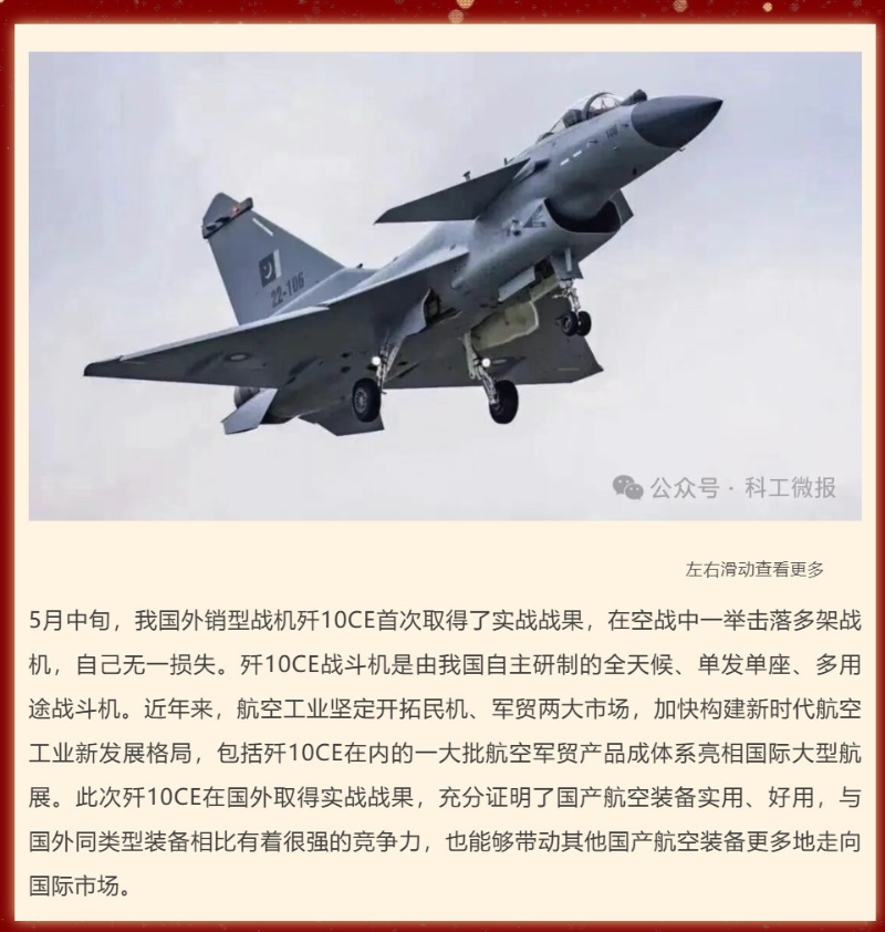 中國國家國防科技工業局新聞宣傳辦公室文章截圖 文章寫道,2025年5月中旬,中國外銷型戰機殲10CE首次取得了實戰戰果,在空戰中一舉擊落多架戰機,自己無一損失。殲10CE戰鬥機是由中國自主研製的全天候、單發單座、多用途戰鬥機。近年來,航空工業堅定開拓民機、軍貿兩大市場,加快構建新時代航空工業新發展格局,包括殲10CE在內的一大批航空軍貿產品成體系亮相國際大型航展。此次殲10CE在國外取得實戰戰果,充分證明了中國國產航空裝備實用、好用,與國外同類型裝備相比有著很強的競爭力,也能够帶動其他中國國產航空裝備更多地走向國際市場。 但文章沒有明確指出,這些戰果的取得。是在印巴衝突期間。 據此前報道,在2025年5月的印巴衝突期間, 巴基斯坦聲稱出動與中國合作獲得的殲-10CE戰機,擊落了6架印度軍機,包括3架法國“陣風”戰機。 據央視新聞此前報道,殲-10CE是中國航空工業自主研製的全天候、單發單座多用途戰鬥機 。具有體系協同作戰、強電磁對抗環境下超視距多目標攻擊,以及多模式對地精確打擊等能力;具有優良的中低空機動格鬥、超聲速飛行、短距起降、大作戰半徑、長航程及空中受油能力;裝備先進的綜合化航空電子系統和武器系統,外掛武器能力強。 2025年7月,針對“一些國家與中國商談采購殲-10戰鬥機”,中國國防部新聞發言人蔣斌回應說,我們在軍品出口方面一貫堅持慎重、負責的態度,願與友好國家分享中國裝備發展成果,為地區與世界和平穩定發揮建設性作用。(完) 【編輯:豐悅】