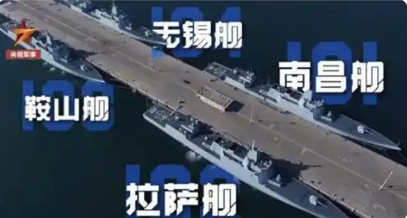 南昌艦等4艘055型驅逐艦近日“同框”的視頻截圖畫面。央視新聞資料圖