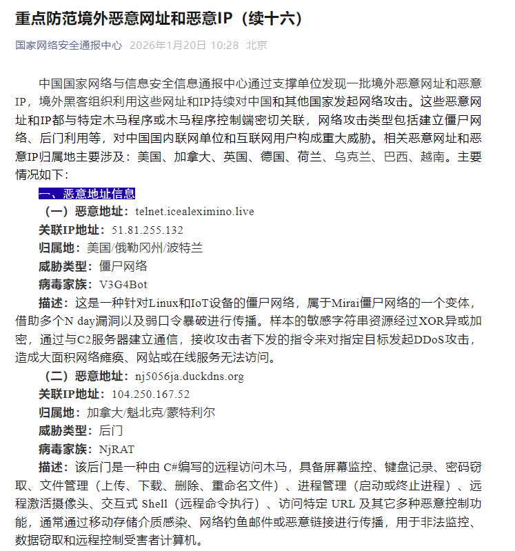 圖源:“國家網絡安全通報中心”公眾號截圖 據介紹,這些惡意網址和IP都與特定木馬程序或木馬程序控制端密切關聯,網絡攻擊類型包括建立僵屍網絡、後門利用等,對中國國內聯網單位和互聯網用戶構成重大威脅。 中國國家網絡與信息安全信息通報中心建議,對所有通過社交平台或電子郵件渠道接收的文件和鏈接保持高度警惕,重點關注其中來源未知或不可信的情況,不要輕易信任或打開相關文件;及時在威脅情報產品或網絡出口防護設備中更新規則,堅決攔截以上惡意網址和惡意IP的訪問;向中國公安機關及時報告,配合開展現場調查和技術溯源。(完) 【編輯:彭玉婷】