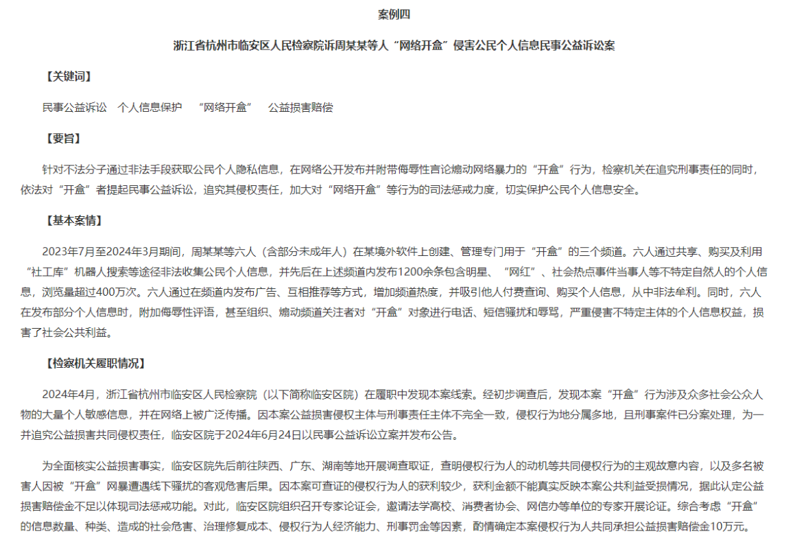 中國最高人民檢察院官網截圖 該案源於2023年7月至2024年3月間,周某某等人在某境外社交軟件上創建並管理三個專門用於“開盒”的頻道,通過購買、共享及“社工庫”機器人等方式,非法獲取明星、“網紅”及社會熱點事件當事人等不特定自然人的身份證號、住址、聯繫方式等敏感信息,發布逾1200條內容,瀏覽量超400萬次。他們還通過附加侮辱性言論、組織粉絲騷擾等方式博取流量牟利,嚴重侵害個人隱私與社會公共利益。 2024年4月,浙江省杭州市臨安區檢察院在履職中發現線索。鑒於刑事案件已分案處理,且侵權主體與刑事責任主體不完全重合,該院於同年6月24日以民事公益訴訟立案。經赴多地調查取證,召開專家論證會綜合評估信息數量、危害程度及修復成本等因素,最終確定公益損害賠償金為10萬元人民幣,遠高於實際非法獲利,以體現司法懲戒。 2025年4月11日,臨安區檢察院向杭州互聯網法院提起訴訟,要求删除信息、賠償損失並公開道歉。因被告在庭審前已主動删除數據、註銷賬號,檢方撤回停止侵權訴求。同年8月28日,法院當庭判決支持全部訴請。目前,賠償金已支付,道歉聲明亦已發布。 全國人大代表伊彤指出,“網絡開盒”暴露出對隱私與尊嚴的漠視,檢察機關通過公益訴訟實現全鏈條追責,為治理網絡暴力提供了重要司法範本。(完) 【編輯:彭玉婷】