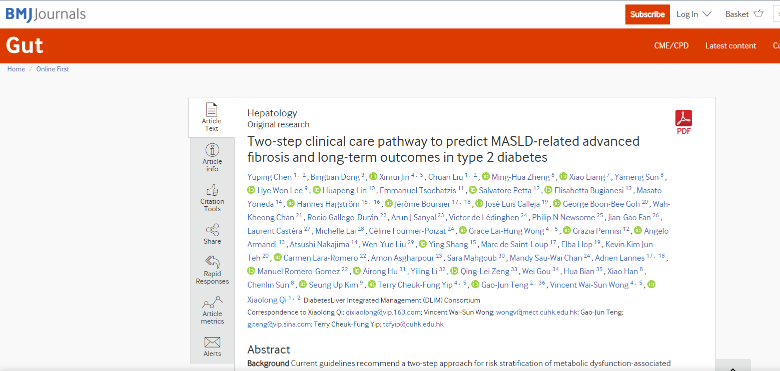 1月21日,國際期刊《腸道》在線發表該成果。圖源:《腸道》官網截圖 該方法有助於及早識別高風險患者,降低心血管事件、肝硬化及全因死亡風險。研究基於中國多中心臨床數據,推動代謝性肝病管理的標準化和精準化,對慢性病防控具有重要意義。 2型糖尿病常與脂肪肝等肝病共生,顯著加劇心血管事件、肝硬化及全因死亡的風險。“中國2型糖尿病患者中,脂肪肝患病率達一半以上,‘糖肝共病’問題已成為公共衛生領域的重要挑戰。”論文通訊作者、東南大學附屬中大醫院院長助理祁小龍介紹,當前國際指南推薦採用FIB-4指數聯合肝硬度的“兩步法”對高危人群進行風險分層,但該策略在2型糖尿病這一高風險人群中對進展期肝纖維化及肝臟相關不良事件的預測價值仍缺乏系統性評估。 為此,研究團隊與中國7個糖肝共管中心以及歐洲、美國及亞洲衛生機構合作,對4700餘名“糖肝共病”患者進行跟蹤研究。研究以肝活檢這一“金標準”為依據,對比“兩步法”與其他無創評分組合的風險分層效能,同時長期隨訪關注肝臟相關不良事件的發生。 研究結果顯示,在肝活檢隊列中,採用FIB-4指數聯合肝硬度“兩步法”策略的整體正確分類率達70.5%,在糖肝共病人群中可有效實現進展期肝纖維化及肝臟相關不良事件的風險分層。同時根據長期隨訪結果,研究團隊建議將FIB-4指數聯合肝硬度的截斷值由“小於8千帕、大於12千帕”優化為“小於10千帕、大於15千帕”,以便更加精準識別“糖肝共病”中風險患者,並對肝臟相關不良事件具有更好的區分能力。(完) 【編輯:彭玉婷】