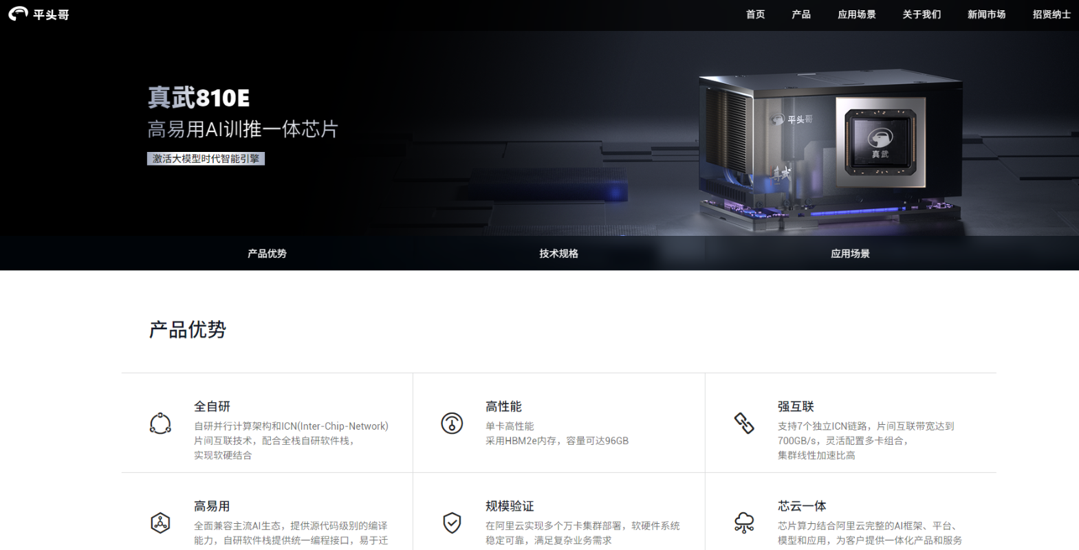 平頭哥官網截圖 據阿里表示,通過在芯片架構(平頭哥)、雲平台架構(阿里雲)和模型架構(通義千問)三個層面深度協同創新,該體系可在雲端實現大模型訓練與推理的極致效率。目前,全球僅有阿里與谷歌同時在大模型、雲計算和AI芯片三大核心領域具備頂尖能力。 據介紹,“真武810E”採用“平頭哥”完全自研的並行計算架構與高帶寬片間互聯技術,配備96GB HBM2e高速內存,片間互聯帶寬高達700GB/s,適用於AI訓練、推理及自動駕駛等高性能計算場景。配合全棧自研軟件棧,該芯片實現了從硬件到算法的端到端優化。 據悉,“真武”PPU已在阿里雲多個萬卡級AI集群中大規模部署,支撐通義千問大模型的高效訓練與推理。目前,該芯片已服務國家電網、中科院、小鵬汽車、新浪微博等400餘家政企客戶,提供涵蓋算力、平台到模型的一體化AI解決方案。 有分析指,此次“真武810E”的發布,不僅彰顯阿里在底層硬科技上的持續投入,更標誌著中國科技企業在構建自主可控AI基礎設施方面邁出關鍵一步。(完) 【編輯:彭玉婷】