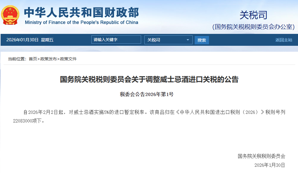 圖片來源:中國國務院關稅稅則委員會網站截圖 1月30日,中國國務院關稅稅則委員會發布公告,宣布調整威士忌酒進口關稅。 據新華社此前消息,中英雙方在英國首相斯塔默訪華期間達成一系列積極成果,中方將威士忌酒進口關稅稅率由10%降至5%。 斯塔默1月28日抵達北京,開始對中國進行為期四天的正式訪問。這是英國首相時隔8年再次訪華。值得關注的是,英國工商界多名大型企業高層代表與斯塔默同行。(完) 【編輯:林曉惠】