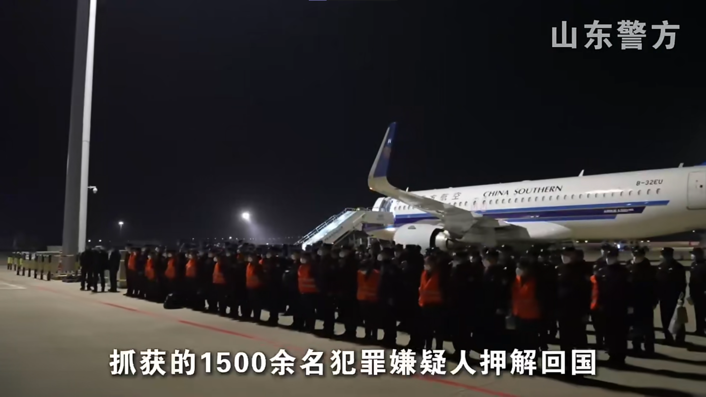 1500餘名犯罪嫌疑人被押解回國。圖源:中國公安部視頻截圖 據悉,長期以來,緬甸妙瓦底地區盤踞著大量賭詐犯罪集團,大肆實施電信網絡詐騙等犯罪活動,危害十分嚴重。2025年初,中緬泰建立聯合打擊電信網絡詐騙犯罪部級協調機制,持續開展多輪打擊行動。