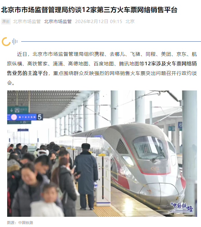 微信公眾號“北京市場監管”截圖 約談會上,北京市市場監督管理局向各平台明確提出四項合規經營要求。主要內容為:全面排查業務模式與服務流程,禁止明示或者暗示消費者可通過付費服務獲得優先購票特權,及時整改車票售罄後的“加速包”“雙通道”“餘票監控”等誤導性宣傳,並自覺接受社會監督。 下架涉嫌誤導性宣傳的產品,調整頁面宣傳內容,禁止採用12306圖片、文字、商標等宣傳,讓消費者誤以為平台與12306存在特定業務合作; 認真做好明碼標價,顯著提醒增值服務內容和價格,及時整改因增值服務提示不醒目導致火車票展示價格和實際支付費用不一致問題,切實保障消費者的知情權。 下一步,北京市市場監督管理局將持續加大監管執法力度,依法嚴厲打擊虛假搶票、誘導交易、價格欺詐等違法行為。同時,歡迎廣大群眾加強對第三方火車票網絡銷售平台服務的監督,共同推動行業規範健康發展,維護公平競爭市場秩序。(完) 【編輯:彭玉婷】