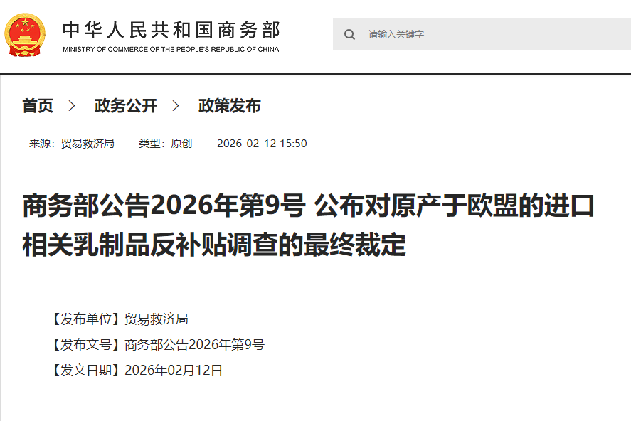 中國商務部網站截圖 據公告,此次徵稅的產品範圍明確,涵蓋鮮乳酪、凝乳、各類加工乳酪(包括藍紋乳酪)、未列名乳酪,以及脂肪含量超10%的未濃縮乳及稀奶油等,對應中國海關稅則號04015000、04061000至04069000。不同歐盟出口商將面臨差異化稅率。 根據規定,反補貼稅自今年2月13日起按從價方式計徵,進口商須向海關繳納相應稅款;進口環節增值稅則以完稅價格(含關稅與反補貼稅)為基數計算。此外,2025年12月23日至2026年2月12日期間已繳納臨時反補貼保證金的進口貨物,將按終裁稅率轉為正式稅款,多退少不補;此前進口產品不予追溯。 商務部強調,該措施旨在維護公平貿易秩序和國內產業合法權益。調查顯示,歐盟部分國家通過財政資助等方式對乳製品企業提供專項補貼,扭曲市場競爭,導致中國同類企業市場份額萎縮、利潤下滑。此次裁決依據《中華人民共和國反補貼條例》,並給予利害關係方充分申辯機會。 未來5年內,相關企業或政府可申請複審;若對裁決不服,亦可提起行政複議或行政訴訟。 分析指出,此輪反補貼措施可能影響愛爾蘭、德國、法國、比利時等主要對華乳製品出口國,亦反映中國在農業與食品領域加強貿易救濟工具運用的趨勢,同時為國內乳業提供階段性保護空間。(完) 【編輯:彭玉婷】