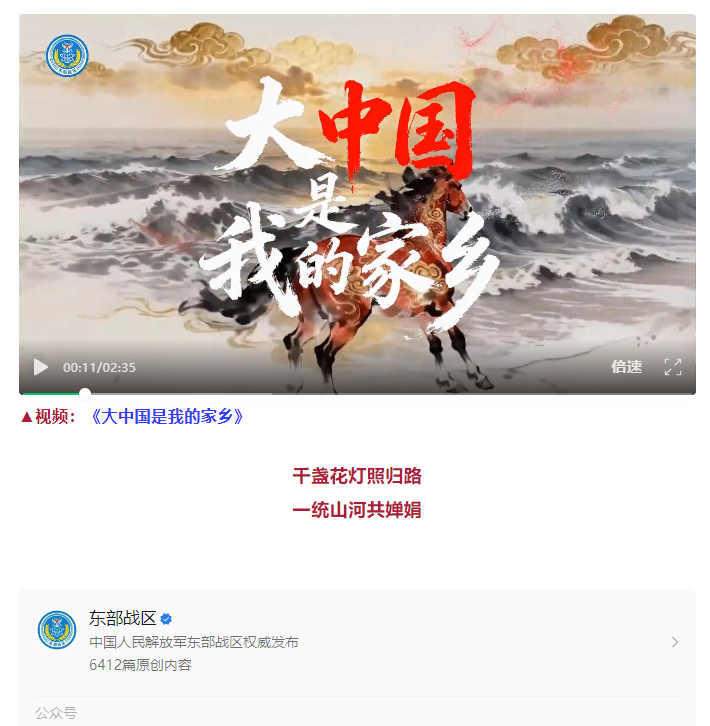 中國人民解放軍東部戰區3日發布主題MV。圖源:“東部戰區”公眾號截圖 3月3日是農曆正月十五元宵節。據東部戰區微信公眾號消息,東部戰區當天發布主題MV《大中國是我的家鄉》。 視頻以解放軍各類軍事裝備展示開場,隨後呈現福建海邊的媽祖像、台北101大樓,以及台灣民眾回大陸謁祖省親的場景。畫面中還穿插了代表元宵節的湯圓、花燈,以及解放軍戰士瞭望台灣、戰機翱翔天際的鏡頭。最後以分藏於兩岸的黃公望《富春山居圖》合璧的圖片結尾。 東部戰區配文寫道:“黃河流過千年歲月,長江拍打萬里河山,阿里山望見歸帆,日月潭映著鄉月,方塊字刻入骨子裡,百家姓融在血脈中,無論此岸彼岸,抬頭都是同一輪月亮。千盞花燈照歸路,一統山河共嬋娟。”(完) 【編輯:彭玉婷】