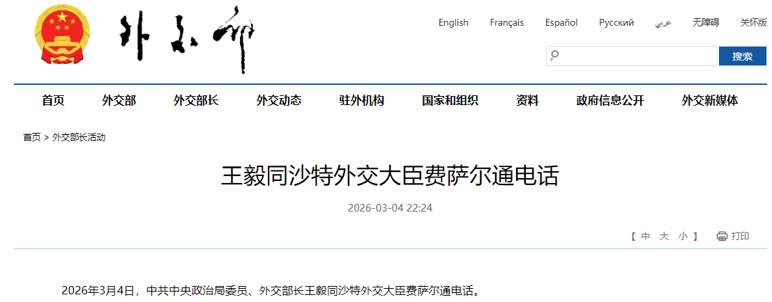 圖源:中國外交部網站截圖 費薩爾介紹了中東局勢最新情況,表示沙方不希望地區陷入戰火,但令人擔憂的是衝突仍在蔓延,且有進一步擴大趨勢。沙方保持了克制,但也保留自衛的權利,希望危機能擺脫升級危險,走向緩和。沙方讚賞中方重視地區安全穩定並為此發揮積極作用,願同中方加強溝通協調,促和止戰,盡早實現中東和平穩定。 王毅表示,無論什麼理由,無差別使用武力的行為都不可接受,任何攻擊無辜平民和非軍事目標的行為都應受到譴責。中方讚賞沙方保持克制,堅持通過和平方式化解分歧。中國始終是維護和平的力量,願繼續發揮建設性作用,將派中東問題特使赴地區國家斡旋。中方強烈呼籲各方停止軍事行動,盡快回歸對話談判,防止緊張事態進一步升級。