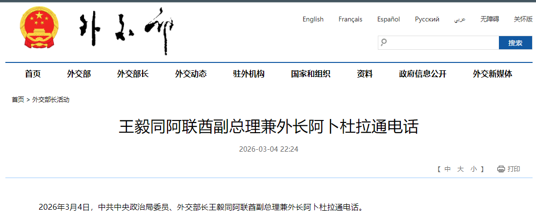 圖源:中國外交部網站截圖 同日,阿聯酋副總理兼外長阿卜杜拉向王毅介紹了地區局勢和阿方立場,表示阿方不是戰爭當事方,沒有參與此次衝突,不應受到非法攻擊。阿方讚賞中方始終秉持客觀公正立場,期待中方在當前嚴峻形勢下繼續發揮積極重要作用,防止地區緊張局勢愈演愈烈。阿方將繼續採取措施維護中方人員和機構的安全。 王毅重申了中方對當前伊朗局勢的原則立場,阿方在戰前就為和平奔走,中方對此表示讚賞。中方不會放棄和平希望,將繼續為此發揮建設性作用,將派中東問題特使赴地區斡旋,推動地區重回和平穩定。(完) 【編輯:彭玉婷】
