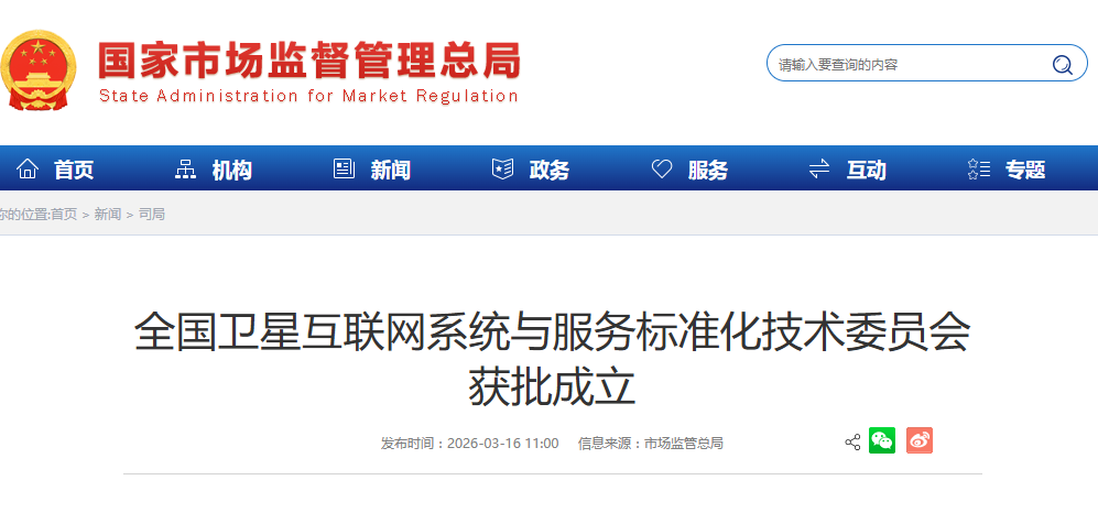 香港中通社3月16日電 中國市場監管總局3月16日正式批准成立全國衛星互聯網系統與服務標準化技術委員會。