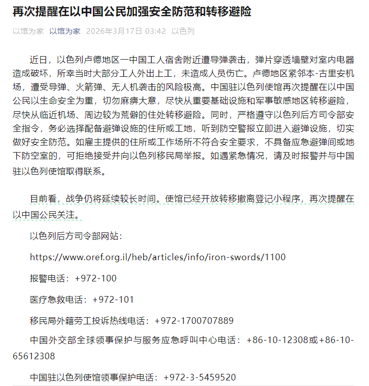香港中通社3月17日電 據微信公眾號“以館為家”消息,3月17日,中國駐以色列使館再次提醒在以中國公民加強安全防範和轉移避險。