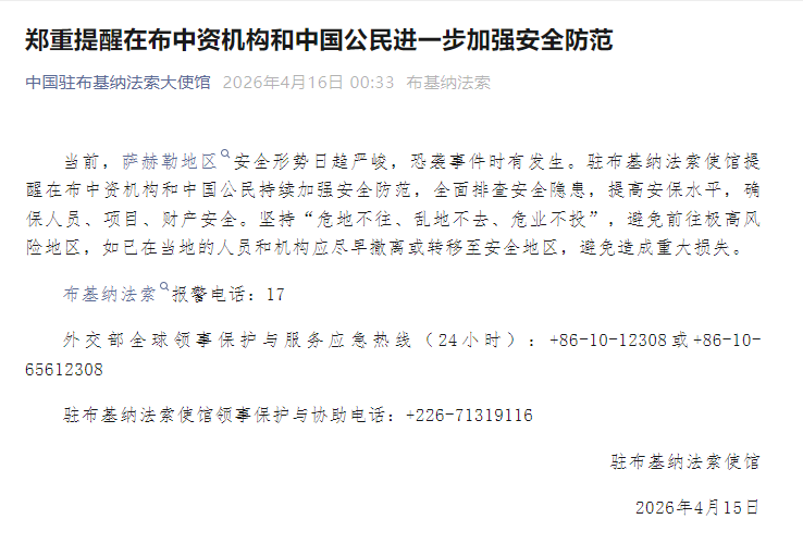 香港中通社4月16日電 中國駐布基納法索大使館公眾號16日發文,鄭重提醒在布中資機構和中國公民進一步加強安全防範。