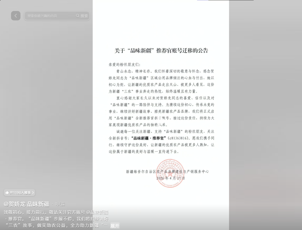 香港中通社4月20日電 已停更100天的賀嬌龍個人抖音賬號19日突然更新,發布一則《關於“品味新疆”推薦官賬號遷移的公告》。公告由中國新疆維吾爾自治區農產品品牌建設與產銷服務中心發布稱,即日起啟用全新官方賬號“品味新疆·推薦官”,承接原由賀嬌龍負責的新疆農產品公益推廣工作。