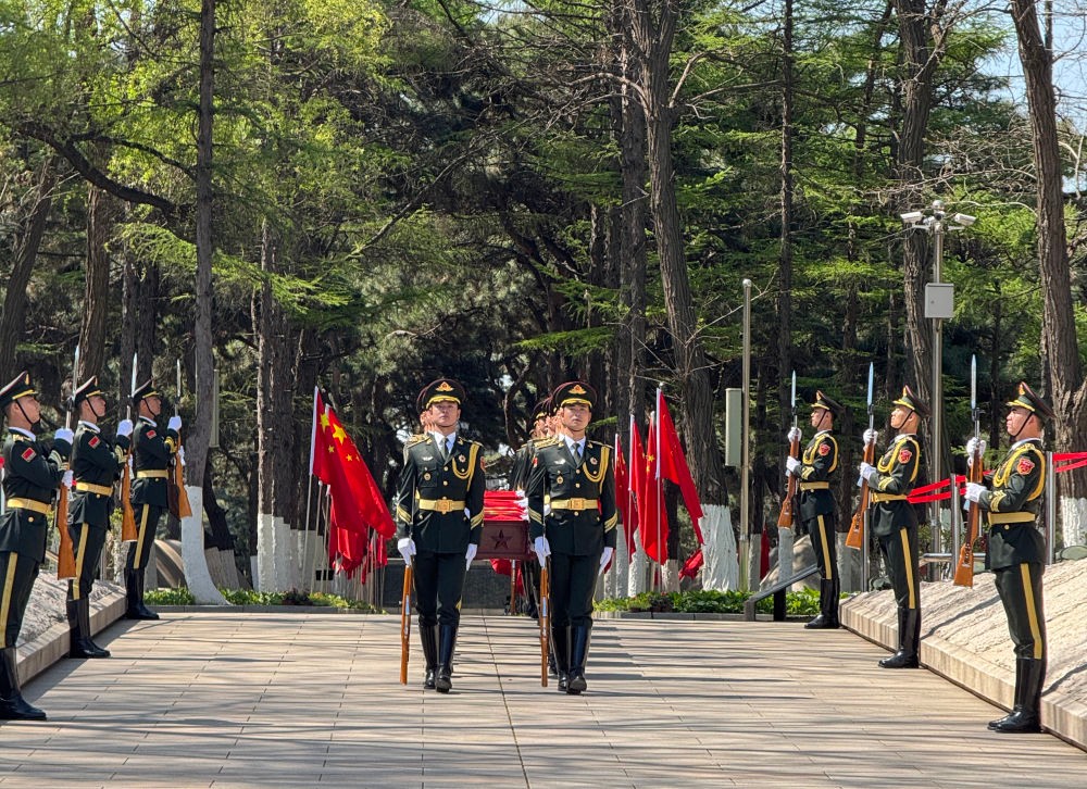 4月23日,第十三批在韓中國人民志願軍烈士遺骸安葬儀式在瀋陽抗美援朝烈士陵園舉行。圖片來源:新華社 4月22日,第十三批12位在韓志願軍烈士遺骸及相關遺物由中國空軍運-20B運輸機從韓國接回至遼寧瀋陽。運-20B運輸機進入中國領空後,4架殲-20戰機護航伴飛,以最高禮儀致敬先烈。 參加迎回儀式的有中國社會各界代表1800多人,包括抗美援朝老戰士、烈士家屬代表、抗美援朝英雄連隊官兵代表、英雄航天員、港澳台師生、青少年學生代表等。神舟二十號飛行乘組指令長陳冬也是其中之一。 自2014年以來,中韓雙方遵循國際法和人道主義原則,已連續成功交接13批共1023位在韓中國人民志願軍烈士遺骸。(完) 【編輯:彭玉婷】