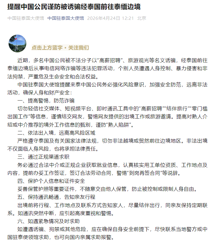 圖源:中國駐泰國大使館官微截圖 中國駐泰國大使館官微4月24日發布消息,近期,多名中國公民被不法分子以“高薪招聘”、旅遊觀光等名義誘騙,經泰國前往泰緬邊境後從事電信網絡詐騙等違法犯罪活動,個別人員遭遇人身控制、暴力侵害和非法拘禁,嚴重危及生命安全和合法權益。 中國駐泰國大使館提醒中國公民:一、提高警惕,防範詐騙。切勿輕信社交媒體中的“高薪招聘”“結伴旅行”“零門檻出國工作”等信息,謹慎結交網友,警惕網友提供的出境工作或旅遊邀請。提高對熟人介紹或中介推薦的境外工作信息的甄別,謹防“熟人陷阱”。 二、嚴格遵守泰國及有關國家法律法規,切勿非法越境或貿然前往邊境地區。非法出境不僅面臨人身風險,也將承擔法律責任。 三、務必通過合法中介或正規企業獲取就業信息,認真核實用工單位資質、工作地點及內容,提前辦妥工作簽證,簽訂合法勞動合同,警惕“到崗再簽合同”等說辭。 大使館還強調,電信網絡詐騙等違法犯罪行為將受到中國及有關國家法律嚴懲,切勿抱有僥幸心理參與其中,以免承擔嚴重法律責任。 據揚子晚報報道,廣東某高校一名女大學生近日受邀前往泰國參加潑水節,下飛機後隨即被控制並轉賣至緬甸電詐園區。其家人為營救已支付3萬U幣(折合人民幣20餘萬元)贖金,卻遭對方一再拖延。目前警方已立案調查。(完) 【編輯:彭玉婷】