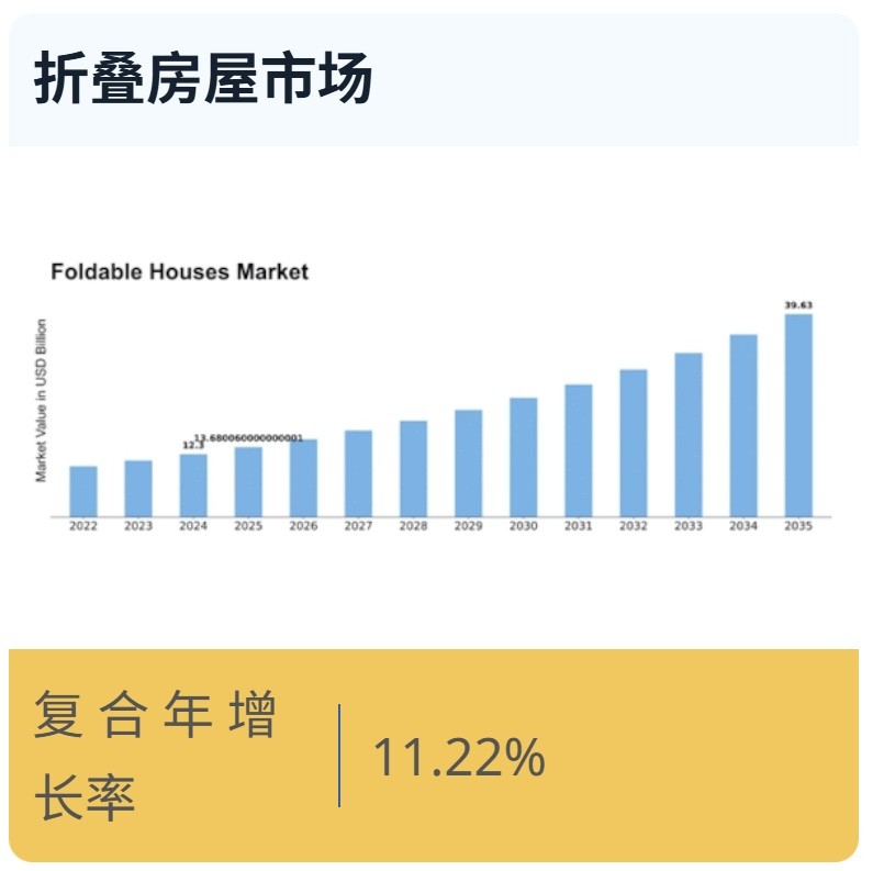 根據4月24日美國市場研究公司Market Research Future發佈的《摺疊房屋市場研究報告》,隨著低成本住房需求的增長,摺疊房屋行業預計將從2025年的136.8億美元增長到2035年的396.3億美元,2025至2035年複合年增長率為11.22%。