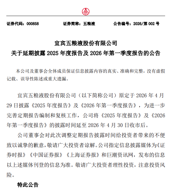 五糧液公告截圖。 公告顯示,五糧液原定於2026年4月29日披露2025年度報告與2026年第一季度報告,為進一步完善定期報告編製、全面完成數據覆核校驗工作,公司決定將兩份財報披露時間順延至4月30日收市後發布。 4月29日中國A股開盤,五糧液低開超2%,報97.88元(人民幣,下同),股價創2020年4月以來新低。 市場分析指,此次五糧液財報延期背後有多重因素。今年2月28日,“廉潔四川”官網發佈消息稱,四川省宜賓五糧液集團有限公司黨委書記、董事長,宜賓五糧液股份有限公司黨委書記、董事長曾從欽涉嫌嚴重違紀違法,目前正接受宜賓市紀委監委紀律審查和監察調查。同日晚間,五糧液發布關於董事長曾從欽被留置的公告;公告同時稱,截至本公告日,公司其他董事和高級管理人員均正常履職,生產經營情況正常。 業績方面,此前財報顯示,五糧液2025年前三季度實現營業收入609.45億元,同比下降10.26%;歸母淨利潤為215.11億元,同比下降13.72%。 中國金融數據和分析工具服務商Wind的數據顯示,2025年五糧液前三季度營收增速為2015年以來首次負增長,淨利潤增速為自2016年以來首次負增長。(完) 【編輯:彭玉婷】