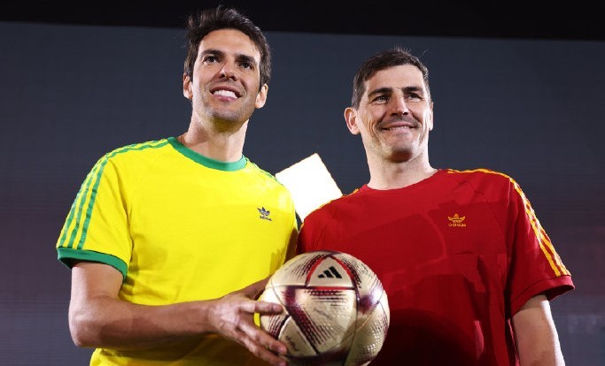 圖:央視網體育 巴西隊前球員卡卡和西班牙隊前球員卡西利亞斯聯手發布卡塔爾世界盃半決賽和決賽的比賽用球。整個足球表面呈現金色,還搭配有紅色條紋。