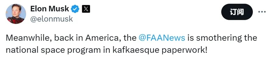 馬斯克28日轉發加拿大退役宇航員哈德菲爾德關於中國登月服帖子的配文 (圖源:馬斯克X賬號帖文截圖) 據韋氏詞典介紹,“卡夫卡式”與捷克猶太裔作家卡夫卡及其作品有關,尤其指“極其複雜、怪異或不合邏輯的”現象。 馬斯克的SpaceX公司此前多次與美國聯邦航空管理局爆出矛盾。當地時間9月17日,美國聯邦航空管理局發表聲明,提議對SpaceX公司處以633009美元的民事罰款,原因是該公司涉嫌在2023年的兩次發射任務中未能遵守相關許可要求。據美國Axios新聞網報道,美國企業家馬斯克同日在社交平台發帖回應,稱SpaceX將起訴FAA,指控其“監管過度”。(完) 【編輯:張麗欣】