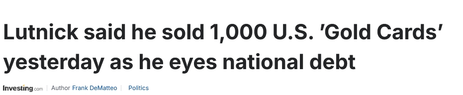 外媒報道截圖 據央視新聞綜合財經新聞網站“Investing”、《印度時報》等外媒報道,當地時間3月20日,美國商務部長盧特尼克在一檔博客中談及美國此前推出的移民“金卡”項目,稱他在一天之內就售出了1000張移民“金卡”。報道指出,此舉旨在幫助償還美國國債。 盧特尼克表示,移民“金卡”可替代傳統綠卡,持卡者可獲得美國永久居留權,並可選擇成為美國公民。不過,盧特尼克指出,大多數人可能不會這麼做,因為一旦成為美國公民,他們就要接受美國的全球徵稅。相反,持卡者將擁有在美國居住的權利,僅需為其在美國境內的收入納稅,而其全球收入無需納稅。 盧特尼克還提到,每張移民“金卡”的售價為500萬美元。若持卡者違反法律,“金卡”可能會被取消。他估計,全世界有3700萬人有能力購買此卡。