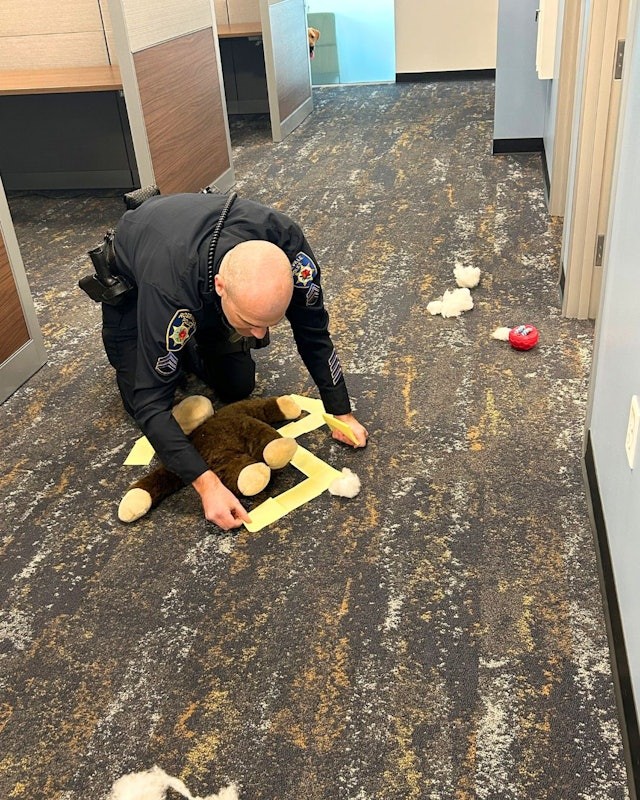 警員用膠帶標示布偶屍體位置。圖源:加州羅斯維爾市警察局官網 雖然變成了疑似破壞布偶的兇手,但平時的巴特卻是隻會認真工作的乖狗狗,牠還會跟警察們一起出門做社區服務。 許多人在看見巴特重返犯罪現場的照片後,紛紛幽默地替他求情:“你們抓錯狗了,牠當時正在跟我們玩撿棍子遊戲。” “作為巴特的律師,我宣布牠是無辜的!” “他絕對無罪。”(完) 【編輯:關秀英】