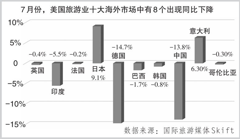 據美國國家旅遊辦公室(NTTO)今年8月11日公佈的最新數據顯示,今年7月份海外赴美旅遊人數下降3.1%,延續今年早些時候開始的下滑趨勢。 NTTO報告稱,受德國遊客數量驟降14.7%的影響,西歐遊客入境人數同比下降 4%。其他主要下降來自中國(下降 13.8%)、瑞士(下降 12.7%)、荷蘭(下降 7.2%)和印度(下降5.5%)。過去6個月中,有5個月的訪問量出現下降,唯一的例外是4月,當時增長1%。 當然,這些數據并不包括來自加拿大和墨西哥的入境遊客,這兩個國家是美國最大的入境旅遊市場。 根據加拿大統計局的數據,今年6月份,加拿大人乘飛機赴美旅行的人數下降22%,駕車過境的人數下降33%,這是連續第六個月下降。總體而言,美國旅遊業十大海外市場中有8個在今年7月份出現同比下降。唯一增長的是日本和意大利。