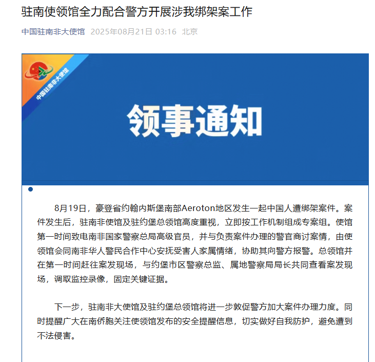香港中通社8月21日電 據中國駐南非大使館21日消息,8月19日,南非豪登省約翰內斯堡南部Aeroton地區發生一起中國人遭綁架案件。案件發生後,中國駐南非使館及駐約堡總領館高度重視,立即按工作機制組成專案組。