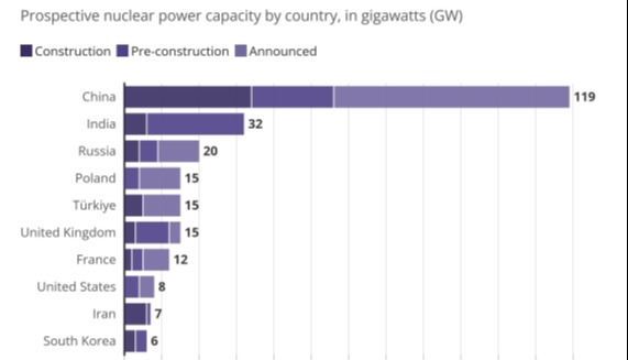 中俄兩國國旗。央視新聞資料圖片 觀察者網報道,利哈喬夫說:“中國有著宏大的核能發展計劃。這項任務的目標是在裝機容量方面超過美國,這意味著總裝機容量要達到100吉瓦(1吉瓦=10億瓦)以上。”他表示,俄羅斯正幫助中國實現這一目標,目前已建成4座裝機容量超過1吉瓦的反應堆,另外4座正在建設中。 利哈喬夫告訴俄媒:“我們在核能領域的合作沒有界限。我認為,我們可以預見核能領域合作在未來幾十年,甚至上百年在廣度和深度上的發展。” 中俄核電合作始於上世紀90年代,1999年10月20日,中俄合作的田灣核電站一期工程正式開工。2007年5月17日,田灣核電站1號機組正式投入商業運行。同年8月16日,田灣核電站2號機組投入商業運行,標誌著田灣核電站一期工程全面投入商業運行。 在一期工程基礎上,田灣核電二期工程開展了一系列重要先進設計和大量自主化優化,3、4號兩台機組分別於2018年2月15日、12月22日投入商業運行。 2018年6月,中俄兩國簽署田灣核電站7、8號機組和徐大堡核電站3、4號機組框架合同,這是迄今為止中俄核能合作最大的項目。2021年5月19日,田灣核電站7、8號機組和徐大堡核電站3、4號機組項目舉行開工儀式。 當前,美國運營著世界上最大規模的核電機組。美國能源信息署(EIA)發布的數據顯示,2024年,美國在運核電機組數量為94台,總裝機容量96.95吉瓦。 美國大部分核電機組建成於上世紀70年代至80年代,進入21世紀後,美國新建的核電機組僅有3座,分別為美國田納西州的瓦茨巴2號機組以及沃格特勒3號和4號機組。美國能源信息署稱,自2013年以來,美國已有12座核反應堆被永久關閉。 截至2024年12月31日,中國並網運行的核電機組58台,機組數量僅次於美國,位居世界第二。國家統計局2月28日發佈的數據顯示,2024年,中國核電裝機容量為60.83吉瓦。這一數字僅次於美國和法國,位列全球第三。 今年4月,中國核能行業協會發布《中國核能發展報告2025》藍皮書。藍皮書顯示,截至當前,中國在運、在建和核准建設的核電機組共102台,裝機容量將達到1.13億千瓦(113吉瓦)。 目前,中國在建核電機組共28台,總裝機容量達到3365萬千瓦(33.65吉瓦),在建機組裝機容量連續18年保持世界第一。中國核電發電量也持續增長。2024年,全國運行核電機組累計發電量達到4447億千瓦時,佔全國發電量的4.72%,位居全球第二。(完) 【編輯:胡雪石】