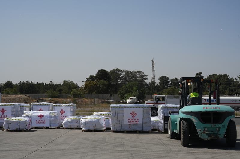 9月7日,在阿富汗喀布爾,中國援助阿富汗的救災物資堆放在停機坪上。圖片來源:新華社