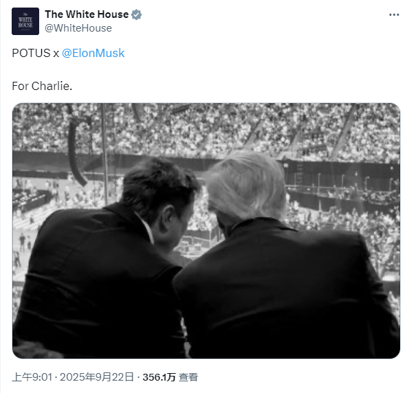 截圖自馬斯克社交平台 白宮官方賬號也上傳了同一時刻拍攝的背面合照,並附上“美國總統與馬斯克”以及“獻給查理”的字眼。