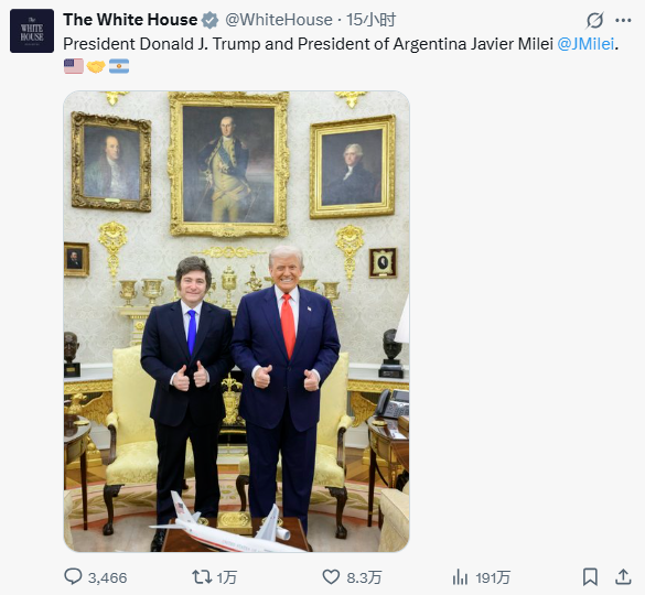 特朗普和米萊會面(美國白宮X截圖) 特朗普當日在白宮與米萊會面,他們共進午餐並合影留念。特朗普稱讚米萊並重申支持後者競選連任,“如果他輸了,我們對阿根廷就不會那麼慷慨了”。 美媒提到,特朗普在9月聯合國大會期間就曾釋放過類似的支持信號,當時他向米萊遞交一份打印件,上面印有他在社交平台上發布的支持米萊的帖文。 阿根廷將在10月26日舉行國會中期選舉,改選眾議院半數席位及參議院三分之一席位。但9月初,米萊領導的執政聯盟“自由前進黨”在被視作中期選舉風向標的地方議會選舉中失利並引發阿根廷金融市場動蕩。米萊的妹妹還捲入賄賂醜聞。這些因素導致米萊的支持率不斷下滑。 為在中期選舉中爭取更多國會席位,米萊政府與美國緊急協商援助計劃,以期在中期選舉前遏制比索擠兌潮,穩定國內金融市場。10月9日,美國財政部宣布直接購入阿根廷比索並與阿根廷央行敲定200億美元貨幣互換框架協議,在兩國引發爭議。美國民主黨人指責說,特朗普支持外國政府的同時卻令本國政府陷入“停擺”。阿根廷經濟界人士質疑美方借此干涉阿根廷的貨幣政策。(完) 【編輯:淩玉輝】