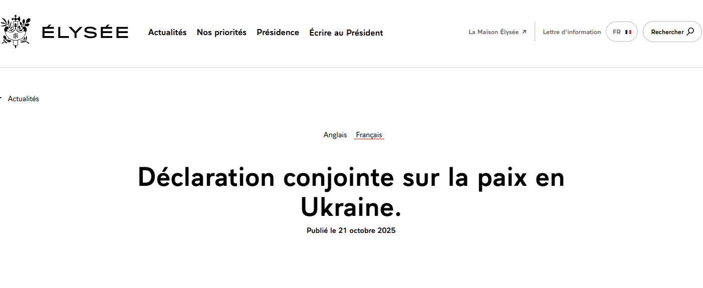 香港中通社10月21日電 法國總統府21日發布一份多名歐洲領導人關於烏克蘭問題的聯合聲明,稱“強烈支持”美國總統特朗普在烏克蘭問題上的立場,即俄羅斯與烏克蘭立即停火,以當前戰線作為談判起點。