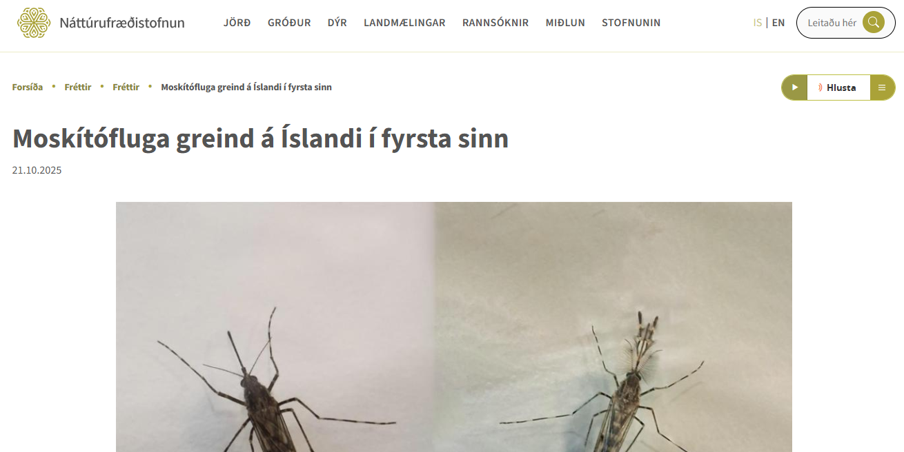 圖片來源:冰島自然歷史研究所網站截圖 綜合22日消息,據《冰島評論》報道,這一發現由昆蟲愛好者哈爾塔森於10月16日晚在戶外誘捕陷阱中發現三隻疑似蚊子的昆蟲後提交,經研究所昆蟲學家馬蒂亞斯松鑒定,確認為“環跗脈毛蚊”,標誌著冰島首次記錄到蚊子在戶外自然環境中出現。 馬蒂亞斯松指出,盡管過去曾在入境航班中發現個別蚊子,但此次是首次在本土戶外環境中確認其存在,具有重大生物學與生態意義。哈爾塔森推測,這些蚊子可能源自約6公里外的工業區,通過國際貨運船隻或集裝箱無意帶入,凸顯全球化物流對物種遷移的影響。