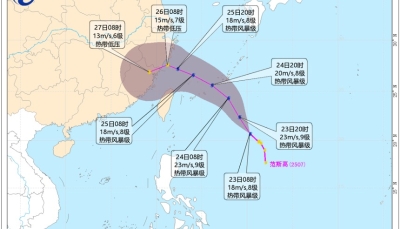 香港中通社11月24日電 今年第27號颱風“天琴”目前位於菲律賓東南方海域,該系統預計這兩天穿越菲律賓中南部群島,進入南海後繼續往西,朝中南半島前進。
