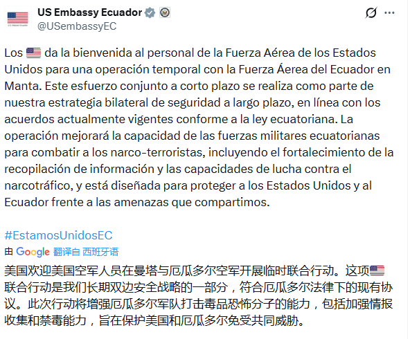 美國駐厄瓜多爾大使館X截圖 綜合消息,美方稱,此次臨時部署是兩國“長期雙邊安全戰略”的組成部分,重點強化厄方情報收集與反毒執法能力。厄瓜多爾總統諾沃亞同日確認該行動,強調其有助於摧毀毒品販運路線。 據報,美國以在南美洲開展禁毒行動為由,曾於1999年至2009年在曼塔駐軍。厄瓜多爾11月16日舉行公投,反對設立外國軍事基地。 與此同時,美國南方司令部同日通報,其“南方之矛”聯合特遣隊在國防部長赫格塞思指令下,在東太平洋國際水域擊沉一艘據稱由“指定恐怖組織”運營的船隻,造成4人死亡。 美國自11月13日起在委內瑞拉附近加勒比海域部署多艘軍艦,並啟動“南方之矛”軍事行動,被廣泛視為對委內瑞拉施壓。美國緝毒署近年報告指出,委內瑞拉並非流入美國毒品的主要來源國。委政府多次譴責美方借“緝毒”之名行軍事干預之實,意圖策動政權更迭,並在拉美擴大軍事存在。 自9月以來,美軍已在加勒比海和東太平洋對所謂“販毒船”發動20餘次打擊,致90餘人死亡,但至今未公開任何確鑿證據證明被襲目標涉毒。(完) 【編輯:淩玉輝】