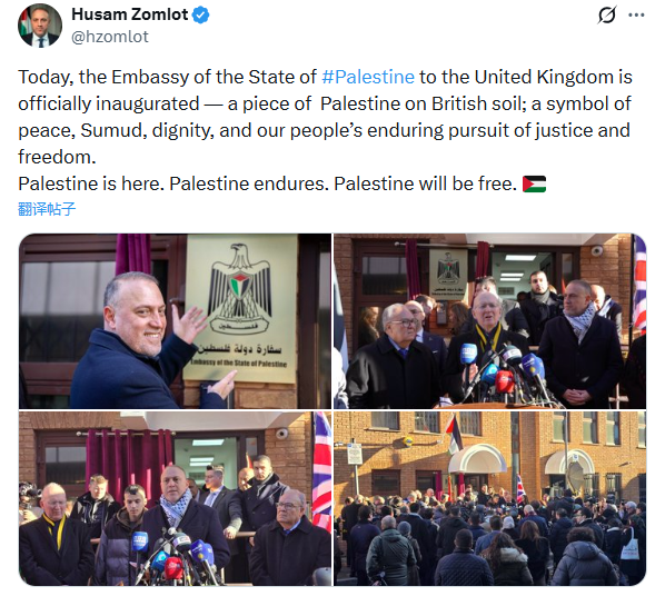 圖為巴勒斯坦國駐英國大使胡薩姆·佐姆洛特X截圖 巴勒斯坦國駐英國大使胡薩姆·佐姆洛特在開館儀式上表示,使館的設立是巴英關係中的“重要里程碑”,標誌著巴勒斯坦國以完整外交身份在英國開展工作。 佐姆洛特當天在社交媒體上表示,新使館象徵著巴勒斯坦人民對正義與自由始終不渝的追求。 2025年9月21日,英國宣布承認巴勒斯坦國。除英國外,加拿大、澳大利亞、葡萄牙等西方國家也相繼宣布承認巴勒斯坦國,這是自2023年10月以哈衝突後,“兩國方案”呼聲高漲的背景下,國際社會承認巴勒斯坦國的最新進展。目前已有超過140個聯合國會員國承認巴勒斯坦國,這些承認行動旨在支持巴勒斯坦建國,但遭到以色列強烈反對。 巴勒斯坦全國委員會於1988宣布建立巴勒斯坦國。(完) 【編輯:淩玉輝】