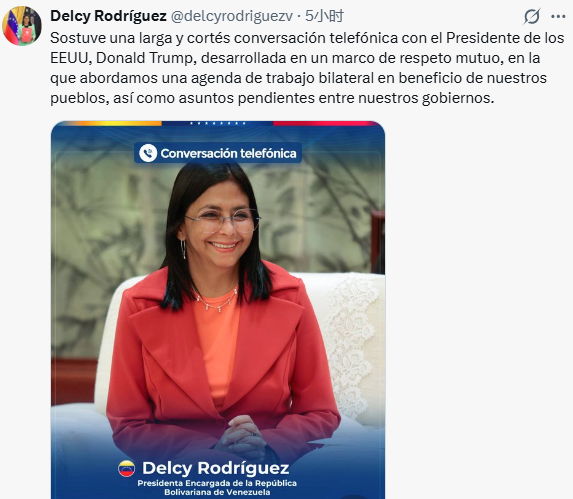 香港中通社1月15日電 委內瑞拉代總統羅德里格斯14日在社交媒體發文說,她當天同美國總統特朗普進行了一次“長時間、富有成效且禮貌”的電話會談。