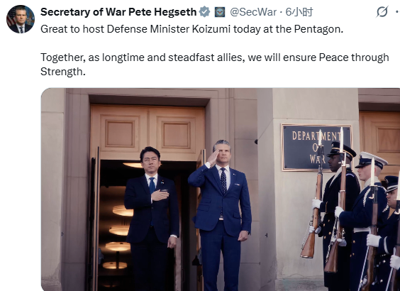 赫格塞思社媒截圖 據共同社16日報道,日美雙方將擴大在沖繩等南西諸島的存在感定位為“同盟的最優先事項”,並同意就改良型攔截導彈“SM-3 Block 2A”的大幅增產推進相關討論。 報道稱,美國政府在《國家安全戰略》中將以南北美洲為主的“西半球”置於最高優先順序。日方則對中國的軍事脅迫深感憂慮,此次會談中再度獲得了美方對參與亞洲事務的保證。在會談後,小泉對媒體稱:“日美同盟沒有任何動搖。” 報道指,雙方確認了日美同盟在印度太平洋地區遏制侵略所發揮的作用,一致同意在南西諸島擴充更具實踐性的聯合訓練,並在防衛產業基礎方面開展緊密合作。雙方還商定將切實推進包括美軍普天間機場(沖繩縣宜野灣市)搬遷至邊野古在內的駐日美軍整編。 赫格塞思在會談中表示,在“第一島鏈”開展軍事演習,對於落實美國政府宣導的“以實力求和平”必不可少。他對高市政府增加防衛費的方針給予積極評價。 小泉還向美方說明了修改3份安保相關文件的討論情況。 在雙方舉行會談前,小泉進次郎當日在維吉尼亞州阿靈頓市的邁爾—亨德森聯合軍事基地大禮堂,接受赫格塞斯的“戰書”,與美國陸軍第3步兵團官兵共同參加體能訓練,透過體能“對決”展現日美同盟的堅定情誼。(完) 【編輯:淩玉輝】