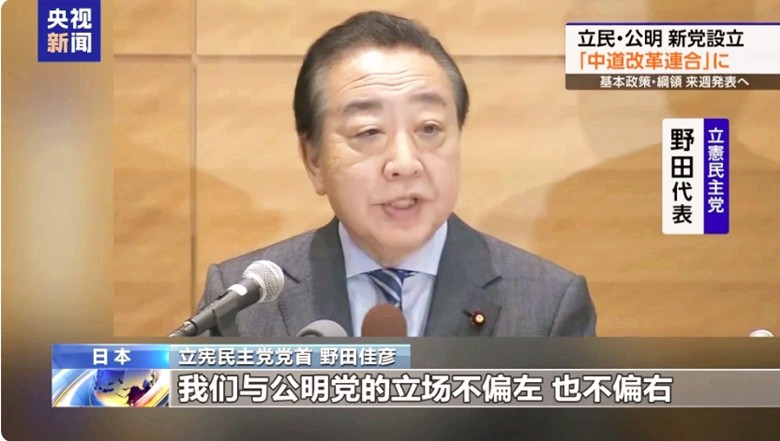 2026年1月16日,日本立憲民主黨黨首野田佳彥表示,我們與公明黨的立場不偏左,也不偏右,即使出現意見不統一的時候,也會通過協商達成一致。我們會以“生活者優先”的視角,推出現實可行的政策。央視新聞報道截圖