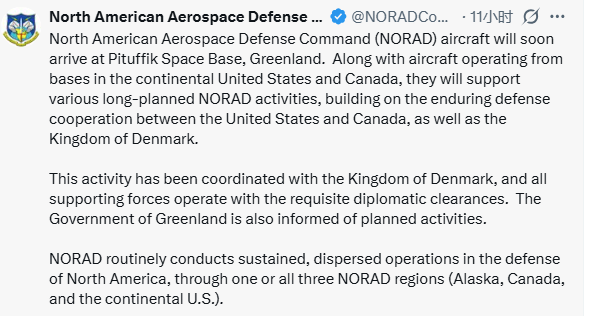 北美防空司令部X截圖 北美防空司令部表示,此次行動已同丹麥協調,相關計劃活動也已通報格陵蘭島政府。 據介紹,這些飛機將支持一系列籌劃已久的行動。此舉建立在美國、加拿大和丹麥持久防務合作的基礎之上。 北美防空司令部由美國和加拿大共同組建,負責北美地區空天預警和防禦。 同一天,挪威國防大臣桑德維克在布魯塞爾北約總部與丹麥國防大臣會晤後表示,挪威不會拒絕參與北約在格陵蘭島周邊的軍事行動,這是應丹麥國防大臣波爾森的要求而發起的。 桑德維克表示,丹麥和美國之間必須開展政治對話,期待對話以建設性的方式進行。此外,北約必須繼續努力加強其在北極地區的存在。 荷蘭國防部19日發表聲明說,此前派往格陵蘭島執行聯合勘察任務的兩名海軍軍官當天撤回。 聲明說,包括荷蘭在內的北約盟國在格陵蘭島的聯合勘察任務為北約在北極地區軍事演訓做了準備,荷蘭軍官貢獻了作戰和後勤方面的專業知識,已按計劃完成任務。 格陵蘭島位於北美洲東北方,是世界第一大島,也是丹麥自治領地,有高度自治權,國防和外交事務由丹麥政府掌管。美國目前在格陵蘭島設有一處軍事基地。美國總統特朗普多次揚言要得到格陵蘭島,並聲稱不排除動用武力的可能性。對此,丹麥等歐洲國家強烈反對。(完) 【編輯:淩玉輝】