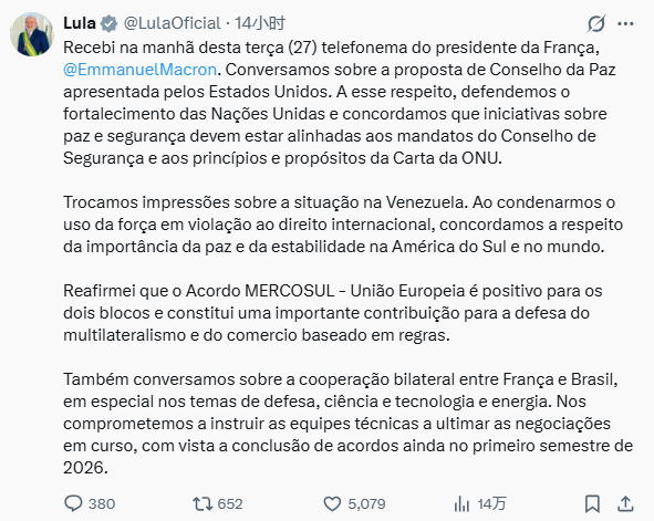 盧拉27日發文表示,接到法國總統馬克龍的電話,雙方討論了美國發起的所謂“和平委員會”的問題(X截圖) 巴西政府當天發布聲明說,通話持續約一小時,兩國元首一致認為,南美洲乃至世界的和平與穩定至關重要。 本月初,美國對委內瑞拉發起大規模軍事行動,突襲委首都加拉加斯等地,強行控制委內瑞拉總統馬杜羅及其夫人並將他們帶至美國。國際社會廣泛譴責美國嚴重侵犯委主權。 此外,盧拉和馬克龍27日還討論了美國發起所謂“和平委員會”。他們主張加強聯合國在相關國際事務中的作用,任何有關和平與安全的倡議都應符合安理會授權以及《聯合國憲章》宗旨和原則。 盧拉在通話中重申,本月17日正式簽署的南方共同市場(南共市)—歐盟自貿協定對雙方都有利,也有利於維護多邊主義和基於規則的貿易。 根據該協定,歐盟和南共市將取消超過九成的雙邊貿易關稅。歐盟對南共市的汽車、機械、葡萄酒和烈酒等出口將顯著受益,南共市的牛肉、糖、稻米、蜂蜜和大豆等農產品進入歐盟市場的准入條件也將改善。 南共市是南美地區最大的經濟一體化組織,正式成員國為阿根廷、巴西、巴拉圭、烏拉圭、玻利維亞和委內瑞拉(因國內局勢自2017年8月起被無限期暫停成員國資格)。聯繫國為智利、秘魯、哥倫比亞、厄瓜多爾、蘇里南、圭亞那。(完) 【編輯:淩玉輝】