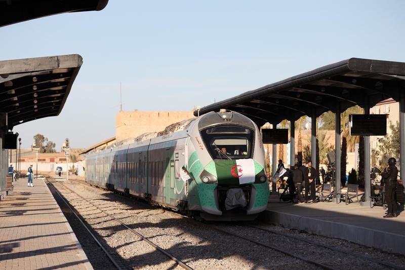 2月1日,在阿爾及利亞貝沙爾省舉辦的該國西部鐵路礦業線專案通車儀式上,一輛列車停靠在月台上。圖片來源:新華社 “感謝中國朋友們克服艱難的自然條件,圓滿完成項目建設。”特本在通車儀式上表示,在中國企業參與下,項目建設速度創下紀錄。 該鐵路礦業線全長約950公里,其中新建的575公里由中國鐵建和當地國有企業共同施工,是中企在阿承建的最大單體工程。據報道,在最高溫達50餘攝氏度的撒哈拉沙漠中,8000餘名中阿建設者僅用24個月就完成了575公里鐵路建設。與此同時,該項目在技術創新、施工組織和產業帶動等方面取得一系列突破,多項指標刷新當地鐵路建設紀錄。